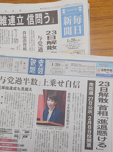 ![]() 1月23日の衆院解散を伝える1月20日付新聞各紙 |